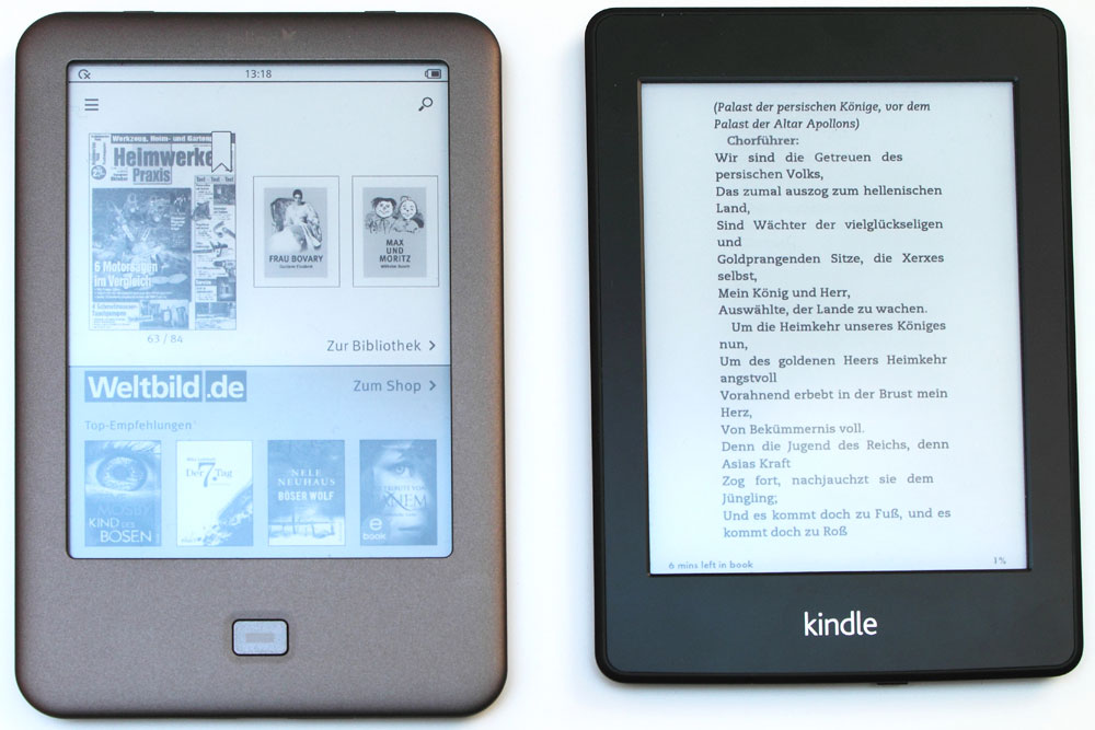 Tolino Shine und Amazon Kindle Paperwhite im Größenvergleich